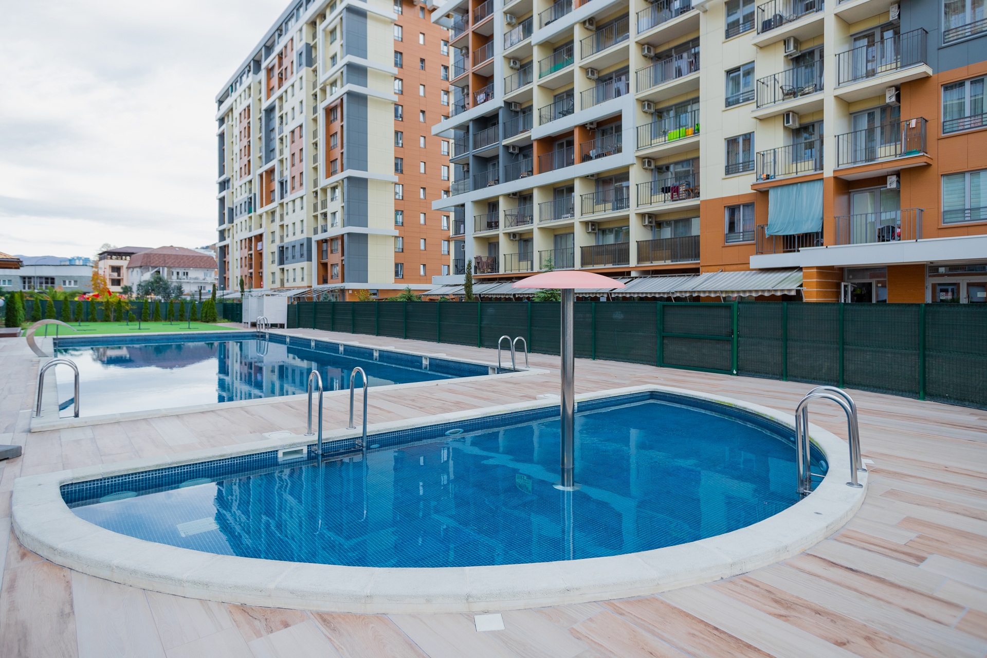 Во внутреннем дворе есть 2 бассейна, 8 площадок для релаксации, 14 детских и 8 спортивных площадок. А в 5 минутах ходьбы — городской пляж. Для владельцев автомобилей есть подземная и наземная парковки